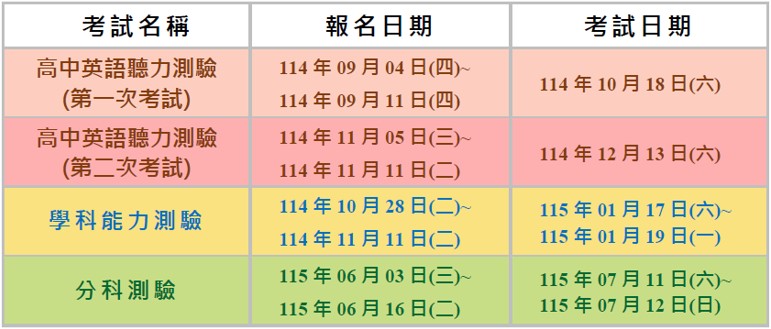 115 學年度各項考試報名及考試日程如下: